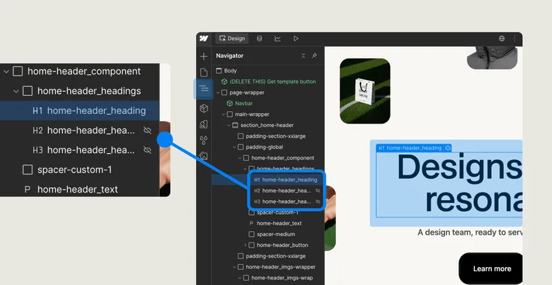 To see and manage all the elements on a page, use the Navigator panel — it’s the icon with stacked layers on the left side of the Webflow Designer. The Navigator shows the full structure of your page in a hierarchy (like folders). This is especially helpful when: